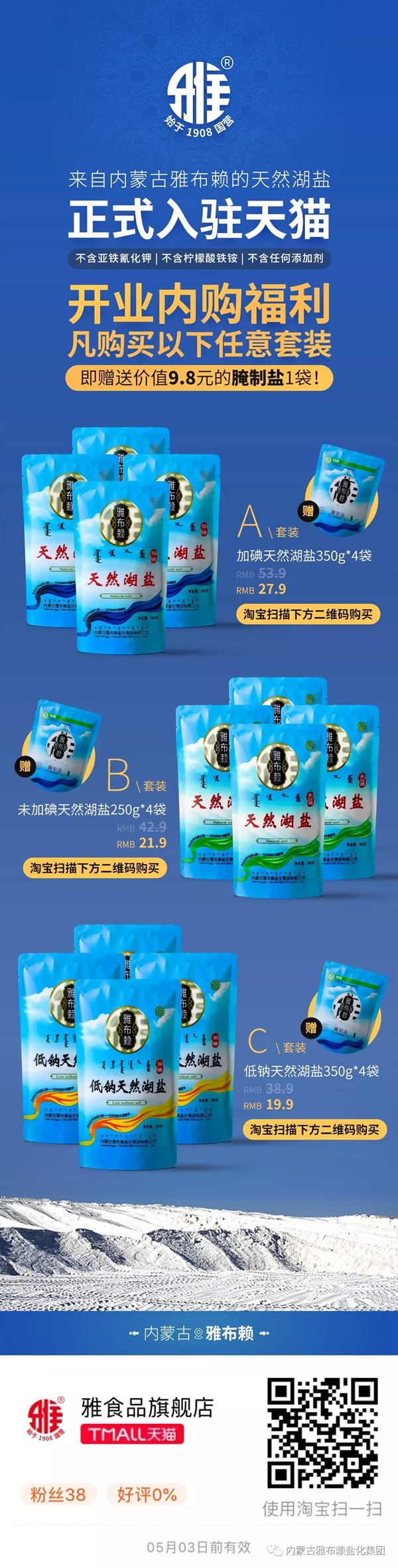 电商公司通过京东的层层严格审核,雅盐天猫旗舰店于4月1日隆重开业。自此,雅盐食用盐、洗涤盐系列8个单品全部上线销售,分别为:大青盐(320g)、低钠天然湖盐(350g)、未加碘天然湖盐(250g)、天然湖盐(350g)、腌制盐(400g)、精制盐(400g、2500g)、果蔬洗涤盐(320g)。 现在,消费者只需在淘宝输入“雅布赖盐”、“雅食品旗舰店”或使用淘宝扫描上图二维码,即可找到由乐鱼网页版·网站入口-乐鱼(中国)